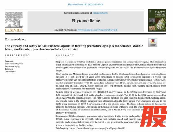 2024年6月,《八子补肾治疗早衰的随机、双盲、安慰剂对照、多中心临床研究》的论文登上欧洲权威医学期刊《Phytomedicine》。研究结果显示,八子补肾组受试者端粒酶含量较安慰剂组增加了150.04 ng/ml,意味着活性提高了76.7%(端粒酶活性越高,衰老程度越低)。八子组老年亚组受试者的5次静坐站立时间(FTSST)、握力、平衡测试、步行速度,以及肌肉质量等运动功能相关指标均得到了改善。